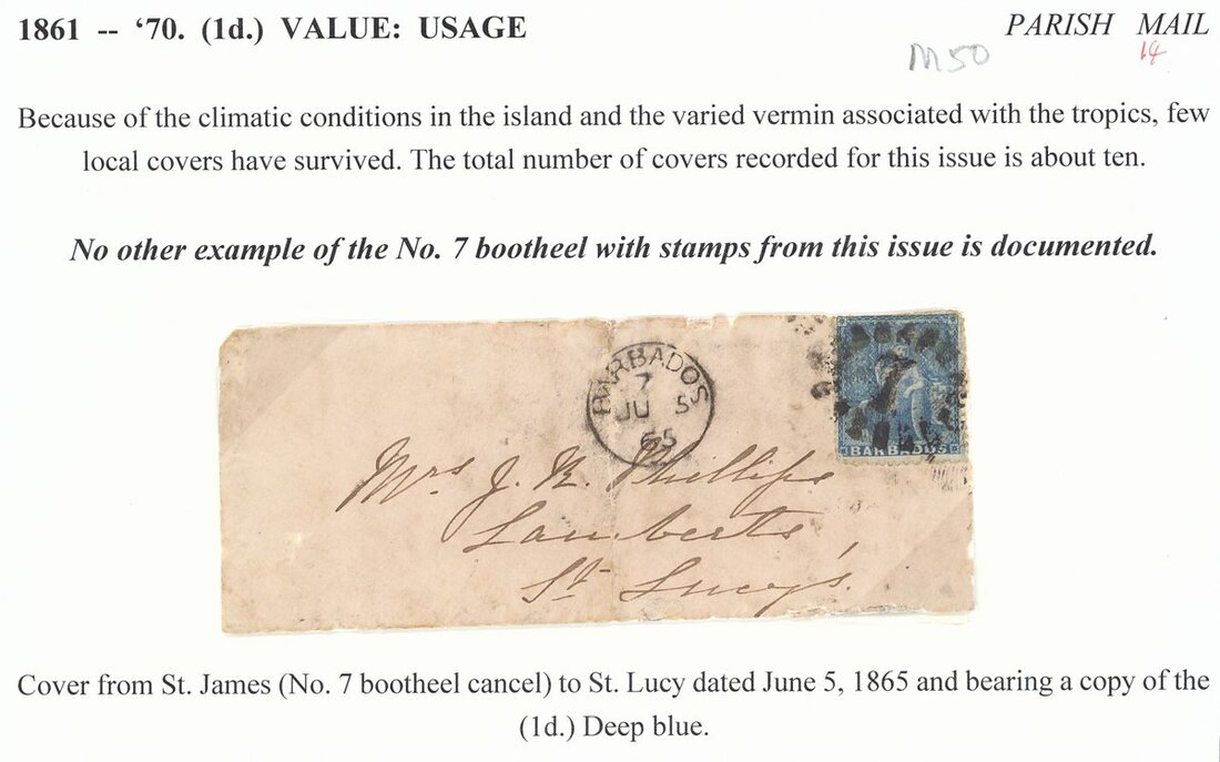 1865 small envelope from St. James to St. Lucy, bearing (1d.) deep blue clearly cancelled and tied by bootheel "7" and with equally fine code "7" datestamp alongside, indistinct local datestamp on reverse; envelope creased, flap missing and other minor imperfections, nevertheless a rare local parish mail franking with this being the only bootheel "7" cover with stamps from this issue and one of only about in total