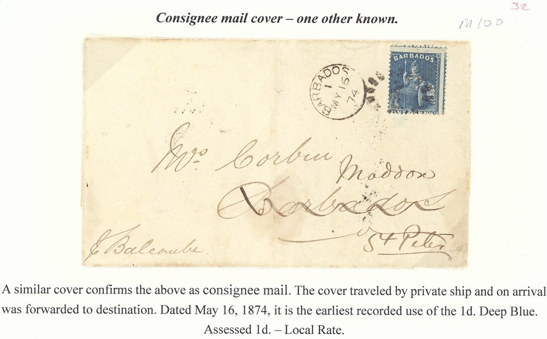 1874 (16 May) consignee entire carried by private ship "Balcombe" to", "Barbados" and on arrival forwarded to destination "Maddox St. Peter", bearing 1874 perf. 14 (1d.) deep blue with light bootheel "1" and with code "1" despatch datestamp alongside, a further indistinct datestamp (17.7?) on reverse; one of only two consignee covers recorded and the earliest recorded date of use of this 1d. value