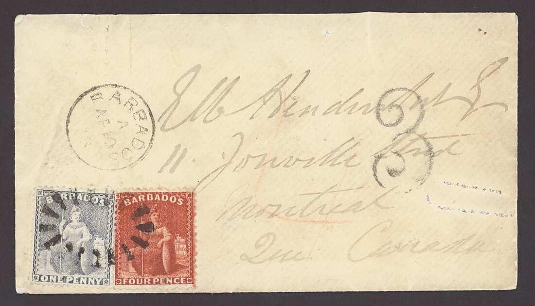 1878 (10 Apr.) envelope to Montreal, bearing 1876-81 perf. 14 1d. grey-blue and 4d. deep red sharing bootheel and with despatch datestamp alongside, manuscript "4" and "3" due on delivery handstamp at right; reverse (flap missing) with despatch and arrival datestamps; paper clip mark at right nevertheless attractive and one of only three covers recorded with this franking