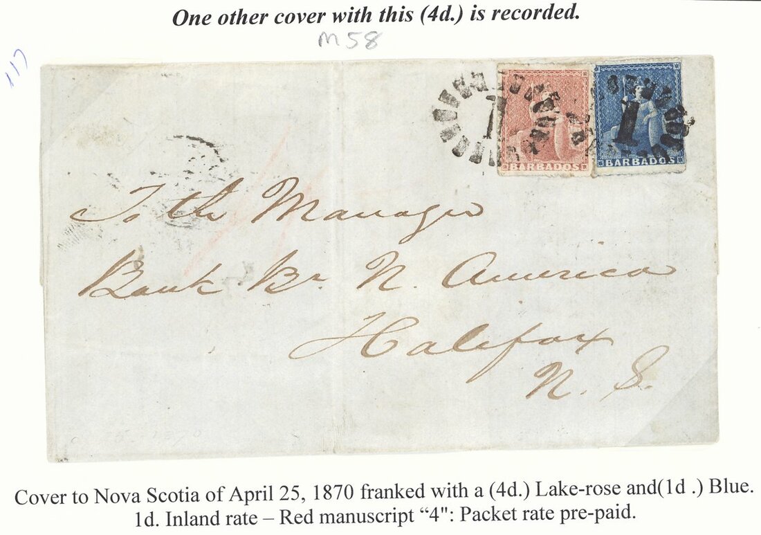1870 (25 Apr.) entire to Halifax, bearing 1861-70 (1d.) deep blue and (4d.) lake-rose both cancelled with bootheel "1" and with despatch, St. Thomas (28.4) and despatch (10.5) datestamps on reverse