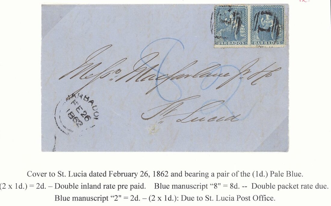 1862 (26 Feb.) double rate entire (less side flaps) ex the Macfarlane correspondence, rated "8" and "2" and bearing 1861 rough perf. (1d.) blue pair cancelled "1" and with despatch datestamp at lower left corner, light arrival datestamp (28.2) on reverse