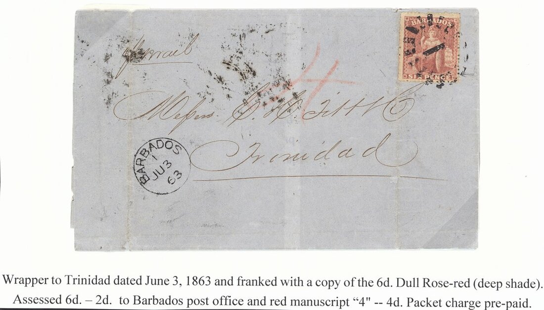 1863 (3 June) near complete entire, rated "4" and bearing 1861 6d. rose-red cancelled with bootheel "1" and with superb despatch datestamp at left, arrival datestamp (damaged) on reverse