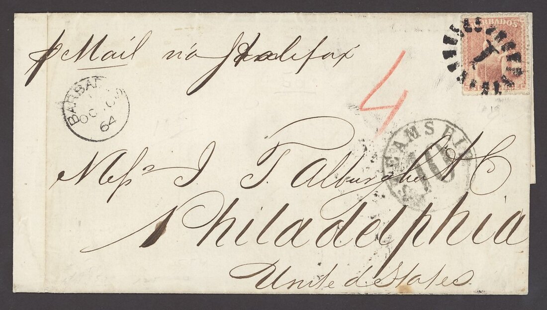 1864 (10 Oct.) entire "p Mail via Halifax" to Philadelphia, rated "4" and bearing 1861-70 6d. rose-red cancelled with bold bootheel "1", showing despatch datestamp, "