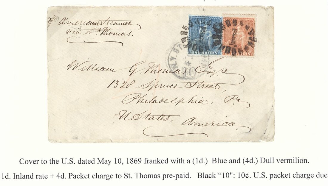 1869 (10 May) envelope "p American Steamer via St. Thomas" to Philadelphia, bearing 1861-70 (1d.) pale blue and (4d.) dull vermilion both cancelled with bootheel "1" and with the (1d.) additionally tied by "