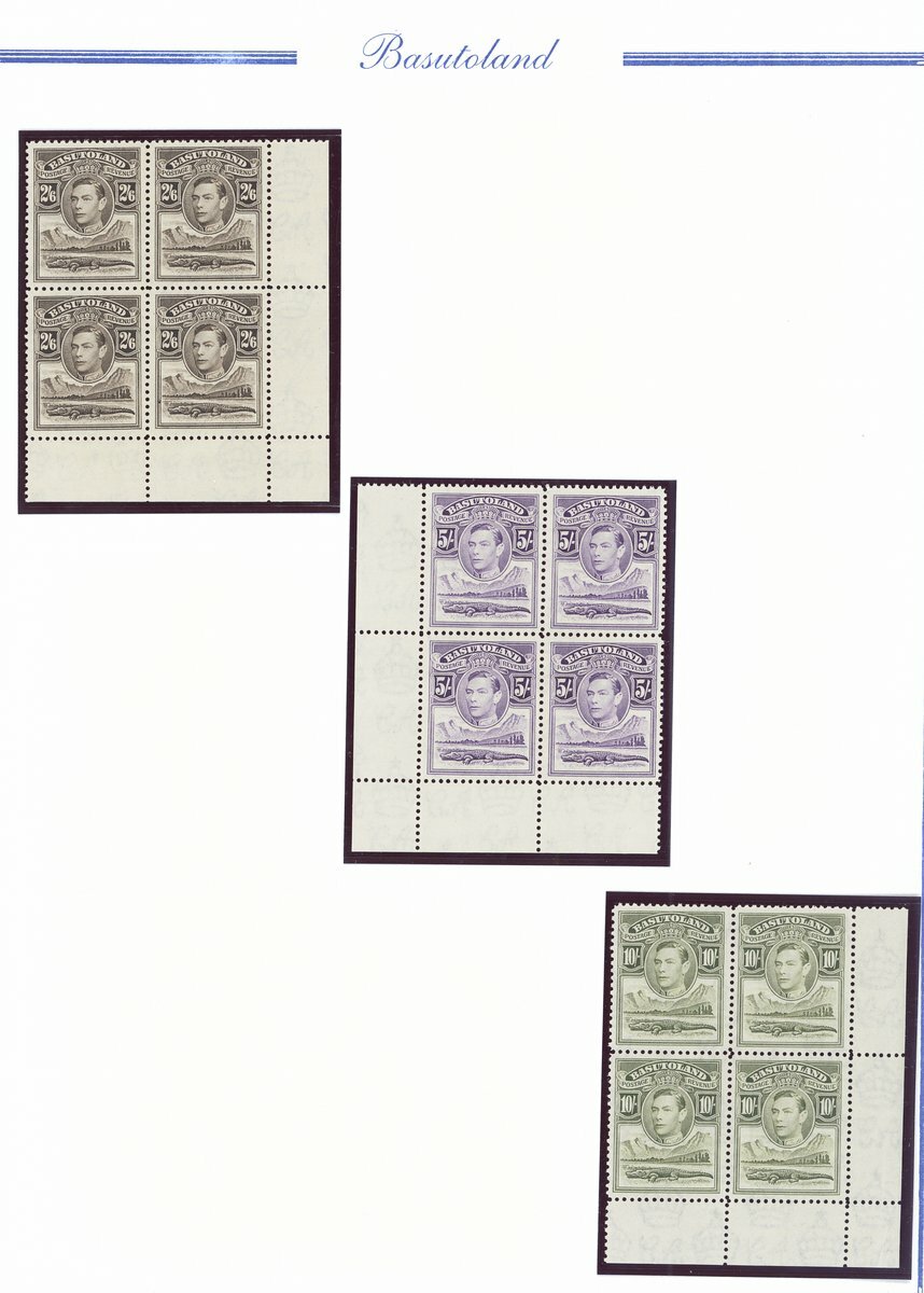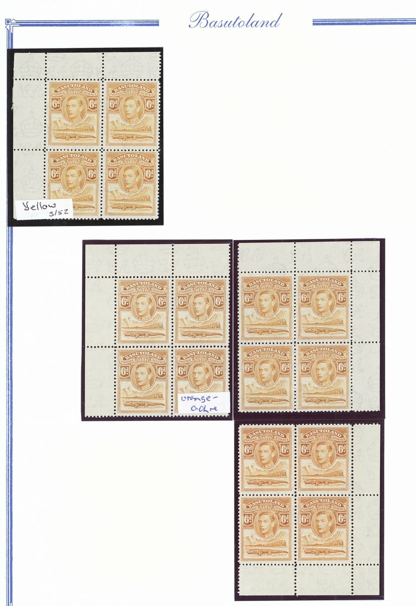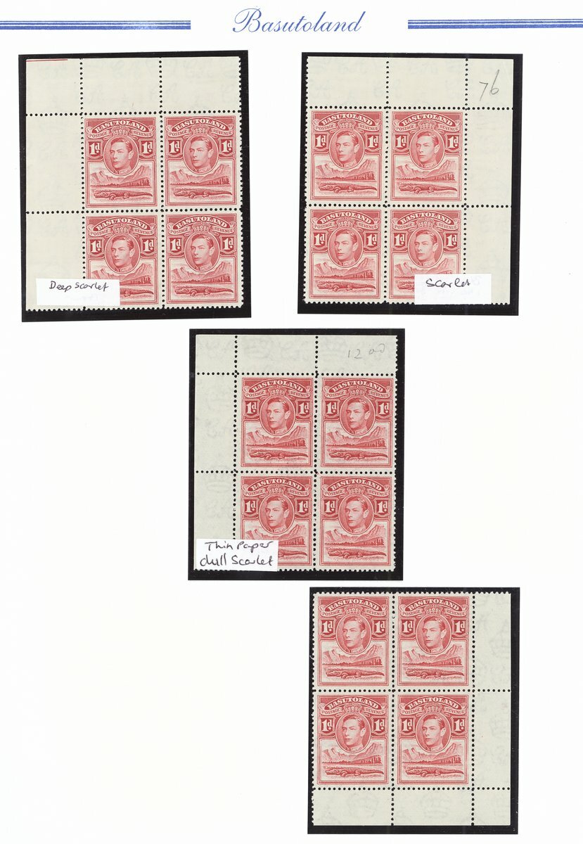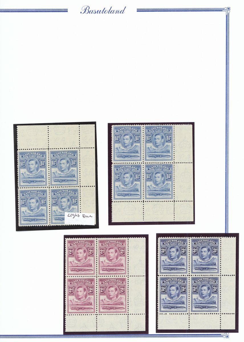 1938 mint collection comprising the set of eleven and additional ½d. (4), 1d. (5), 1½d., 2d. (4), 3d., 4d. (2), 6d. (3) and 1/- (2), all in blocks of four, ½d. blocks of six and eight, 1d. blocks of six and eight (with tower flaw), 2d. blocks of ten and fourteen and 3d. blocks of ten (2), all but one ½d. and 1d. from the corners of the sheet, some shades and a few on thinner paper, also ½ marginal single printed on creased paper, fine unmounted mint; also the set of eleven on first day cover envelope from Leribe addressed locally. Cat. £970