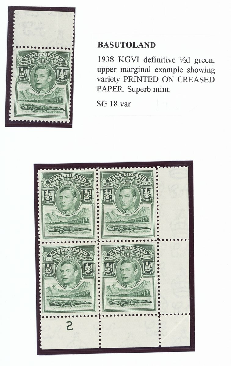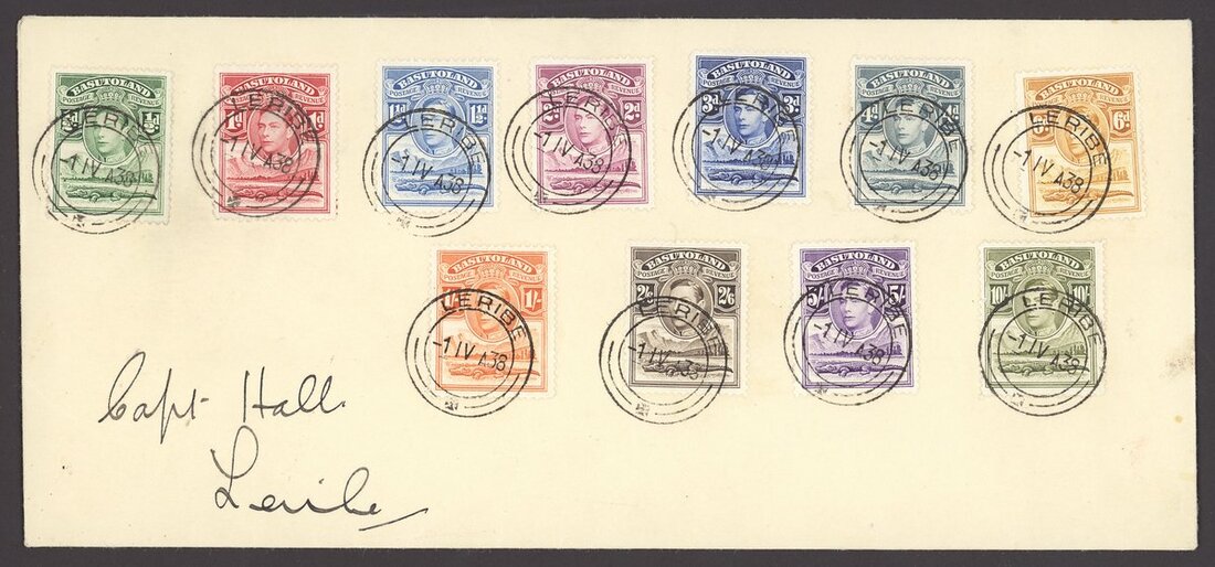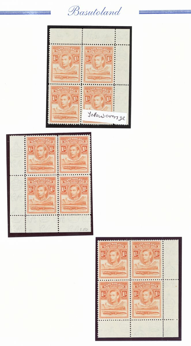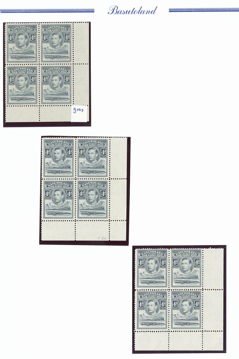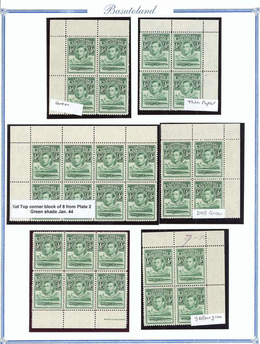 1938 mint collection comprising the set of eleven and additional ½d. (4), 1d. (5), 1½d., 2d. (4), 3d., 4d. (2), 6d. (3) and 1/- (2), all in blocks of four, ½d. blocks of six and eight, 1d. blocks of six and eight (with tower flaw), 2d. blocks of ten and fourteen and 3d. blocks of ten (2), all but one ½d. and 1d. from the corners of the sheet, some shades and a few on thinner paper, also ½ marginal single printed on creased paper, fine unmounted mint; also the set of eleven on first day cover envelope from Leribe addressed locally. Cat. £970