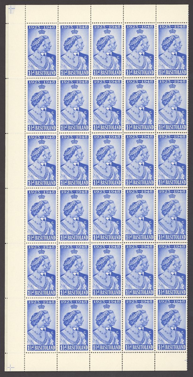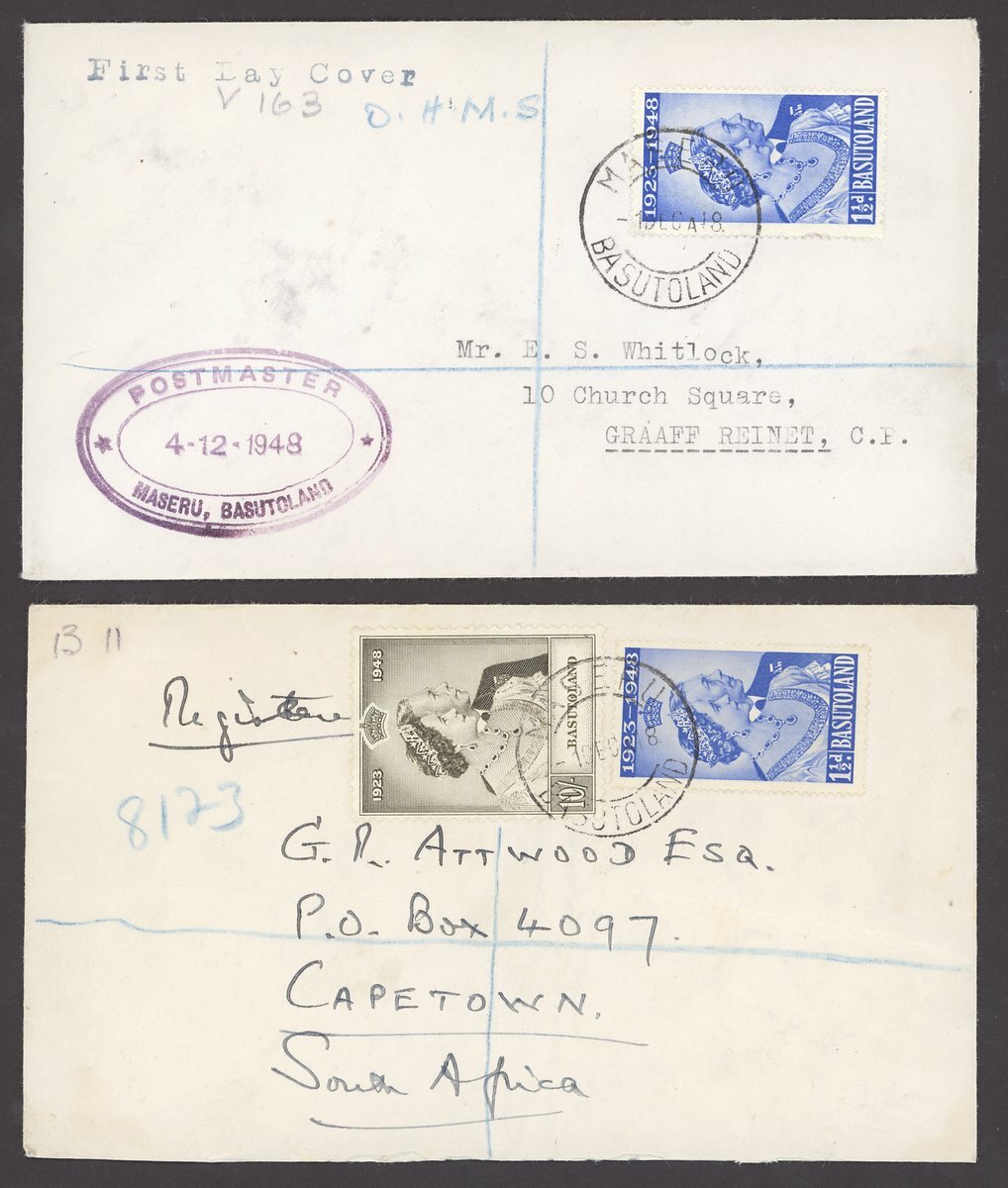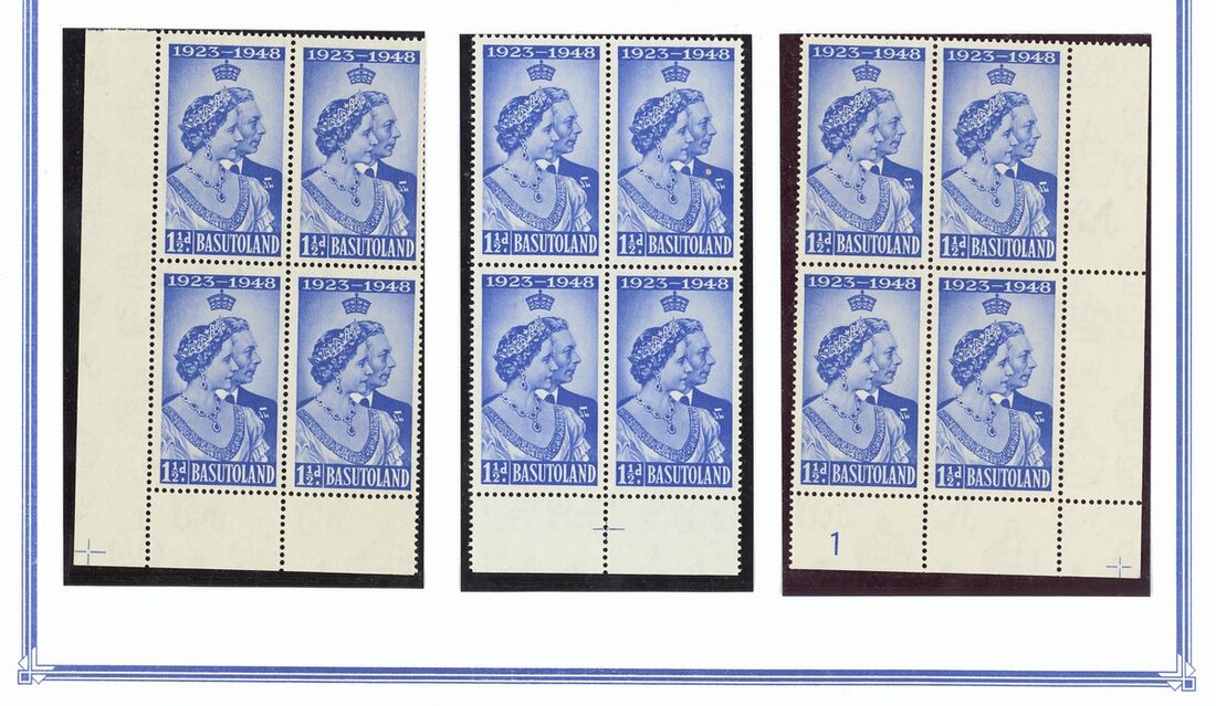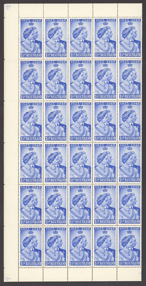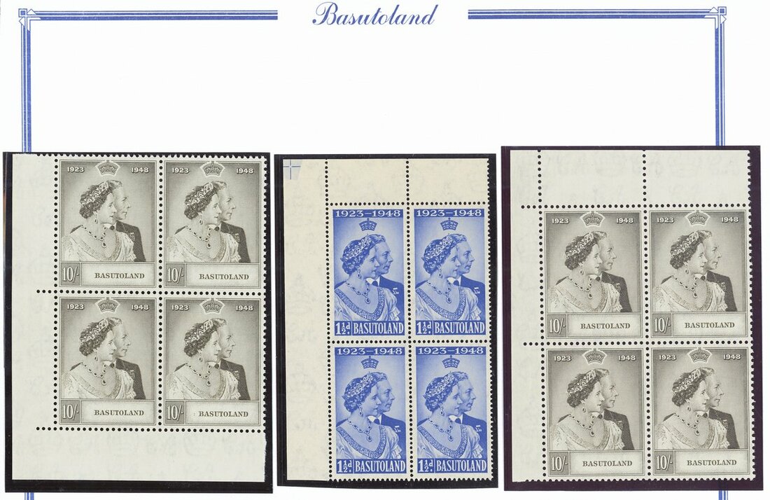 1948 Royal Silver Wedding collection mint and used sets, 1½d. complete mint sheets, 1½d. blocks of four (7, one used, all but one corner or marginal) and 10/- mint blocks of four (two from corners of the sheet), fine unmounted mint; also four first day covers, three from Maseru and two bearing both values
