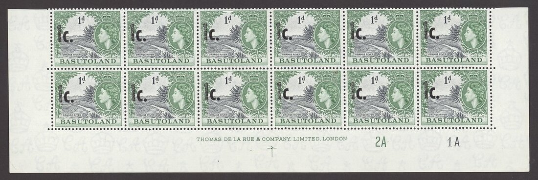 1c. on 1d. grey-black and bluish green so-called special printing with surcharge on far left, a block of twelve from the foot of the sheet with full margins, 1A/2A plate number and imprint, fine unmounted mint. A very rare and spectacular multiple of this rare variety