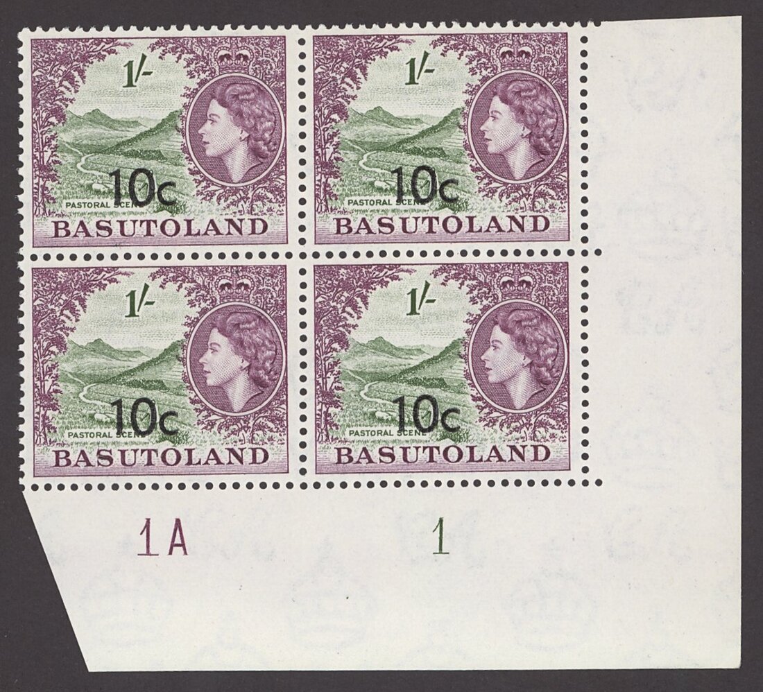 10c. on 1/- bronze-green and purple Type II lower right corner block of four with Plate 1A/1, fine unmounted mint