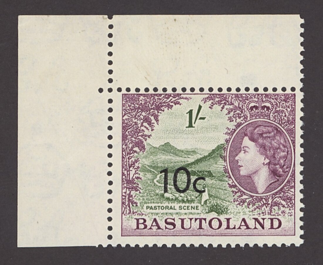 10c. on 1/- bronze-green and purple Type II upper left corner example, unmounted mint; minor wrinkle in margin