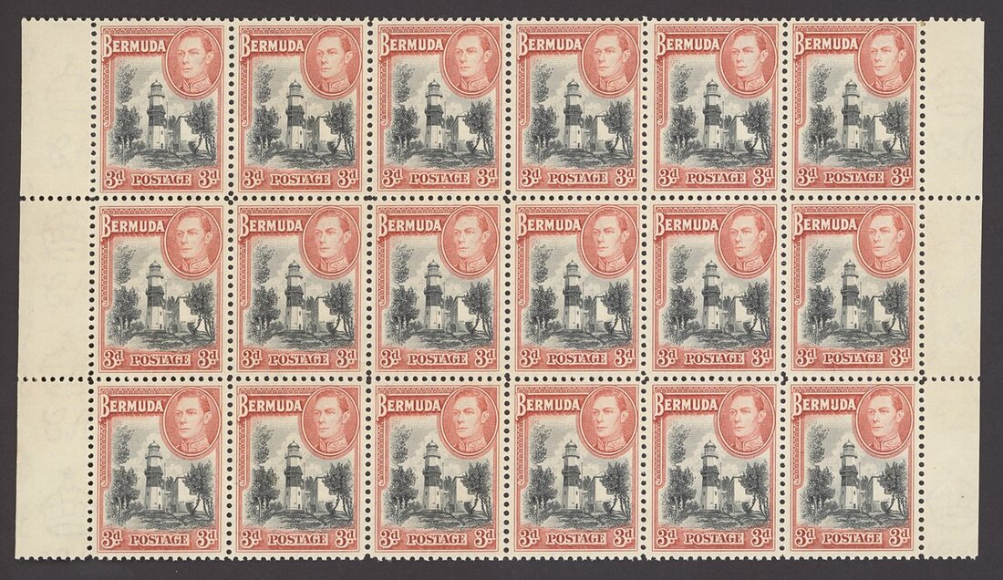 1938-52 3d. black and rose-red, unmounted block of eighteen with margins on either side; toned gum but with fresh appearance. S.G. 114, £900