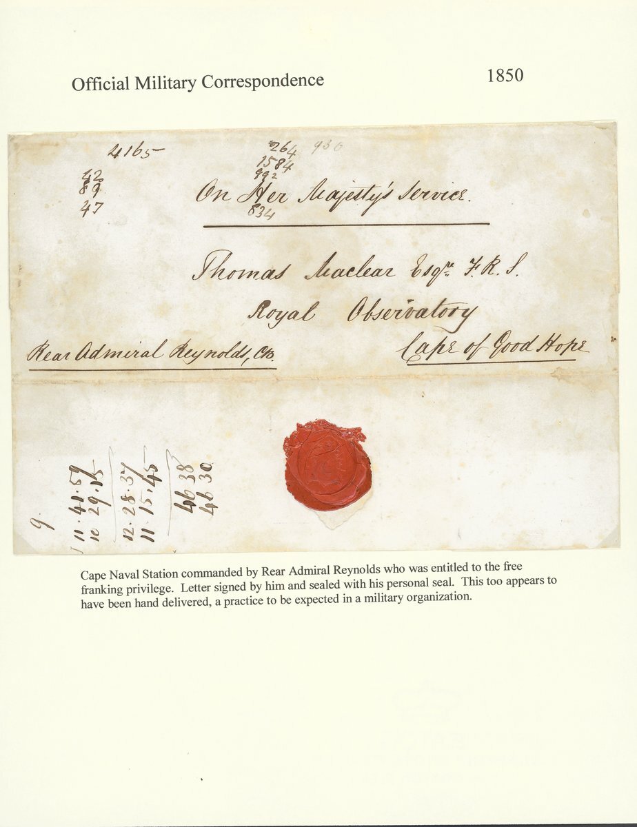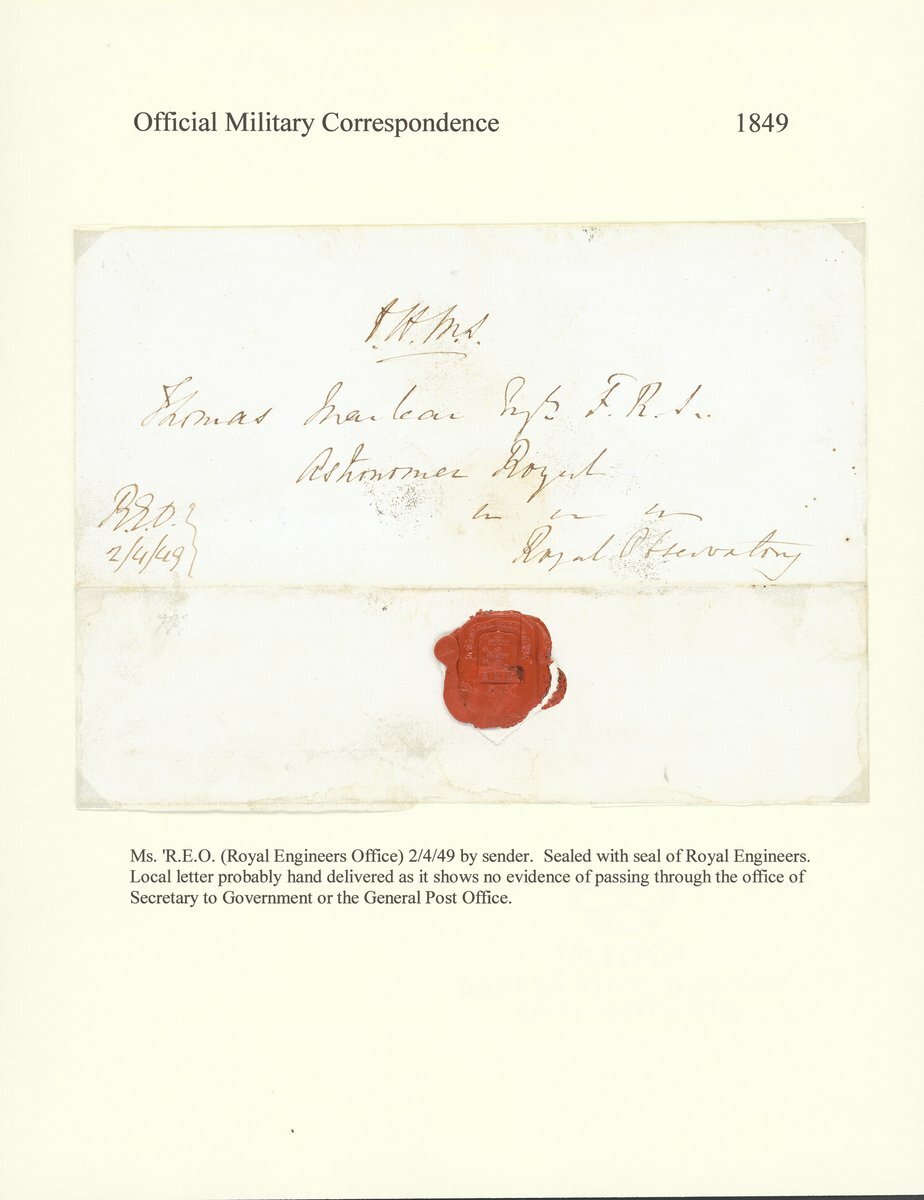 1849 Official entires (2, one with light staining) addressed to the Royal Observatory, Cape of Good Hope, one marked "R.E.O" (Royal Engineers Office) at lower left and with the seal of the Royal Engineers on reverse, the other signed by Rear Admiral Reynolds who commanded the Cape Naval Station; both apparently delivered by hand