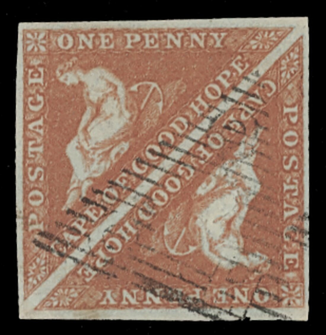 1d. pale brick-red pair with good to large margins, neatly and lightly cancelled, slight loss of blueing, fine. S.G. 1, £900. Photo