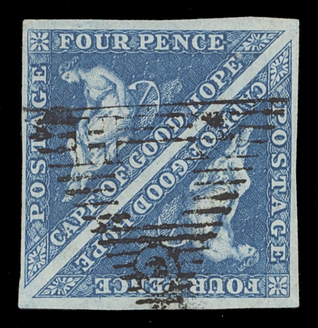 4d. deep blue pair with good margins on three sides and small on the fourth, neatly cancelled, very fine. S.G. 2, £550. Photo