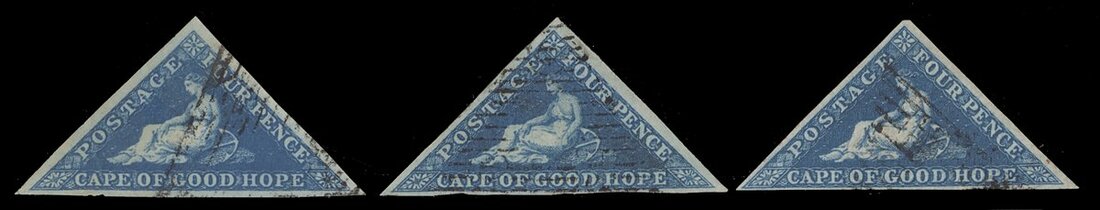 4d. deep blue, three examples, one with good to large margins and showing vertical line in first