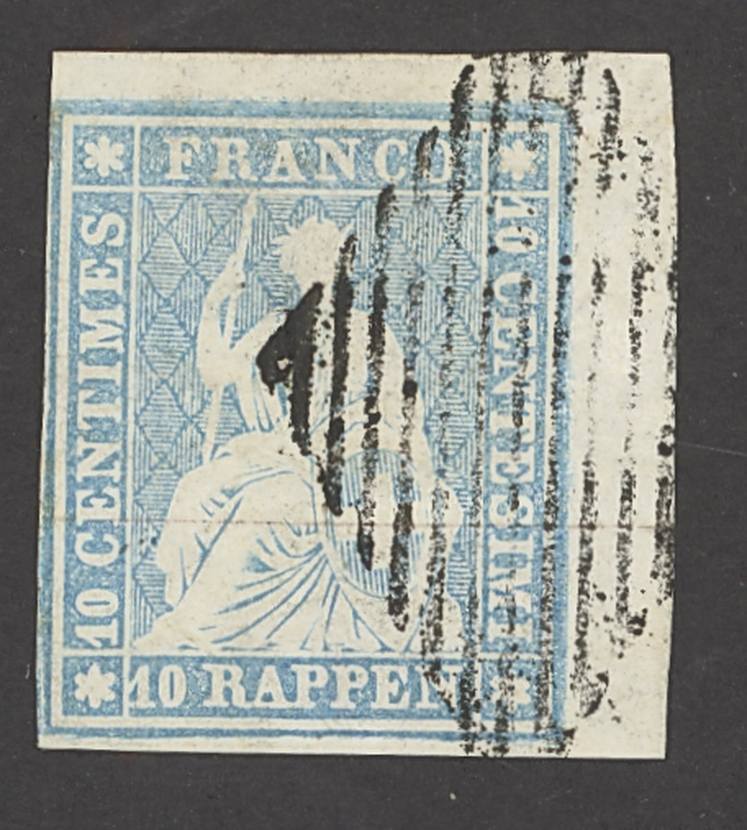 10r. blue, red thread, from the upper right corner of the sheet, barely touched at left, black Federal grid cancellation; fine. Zumstein 23Ez