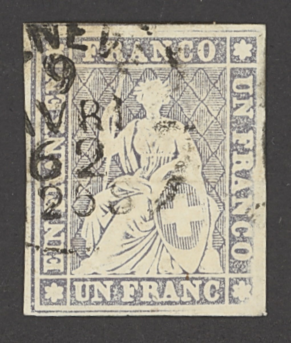 1f. blue-grey, yellow thread and showing plate wear at right, margins all round, Geneva c.d.s.; fine and attractive. Zumstein 27D
