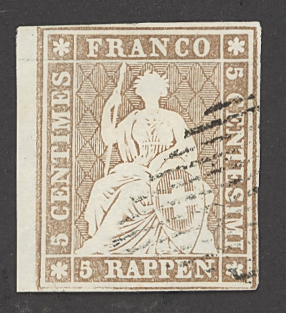 5r. matt brown, sheet margin at left, outer frame line just touched at lower right, light Federal grid cancellation which leaves the face of Helvetia clear; fine. Marchand Certificate (2009). Zumstein 22F