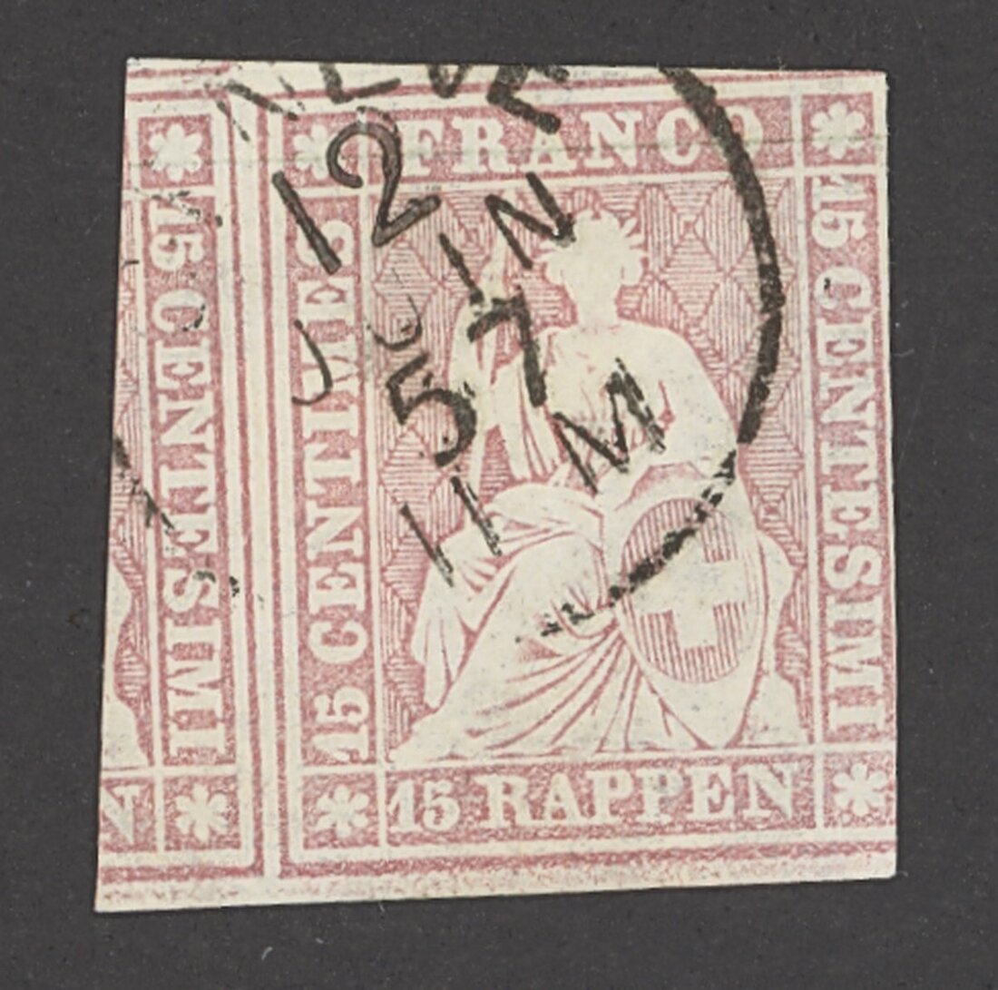 15r. rose, a little touched or cut into at right but showing a good portion of the adjoining stamp at left, Geneva c.d.s., fine. Zumstein 24F