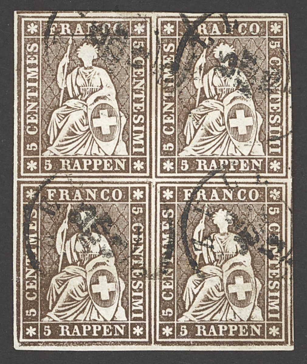 5r. brown, block of four with large margins all round and showing traces of two adjoining stamps at right, c.d.s. cancellations; threads missing but superb appearance. Zumstein 22G
