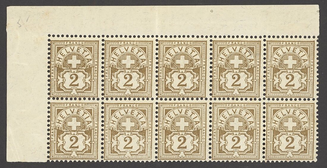 2c. olive-bistre, block of 10 (5x2) from the upper left corner of the sheet; unmounted mint, hinged in the margins and one with small area of disturbed gum. Fine. S.G.126A, £450+