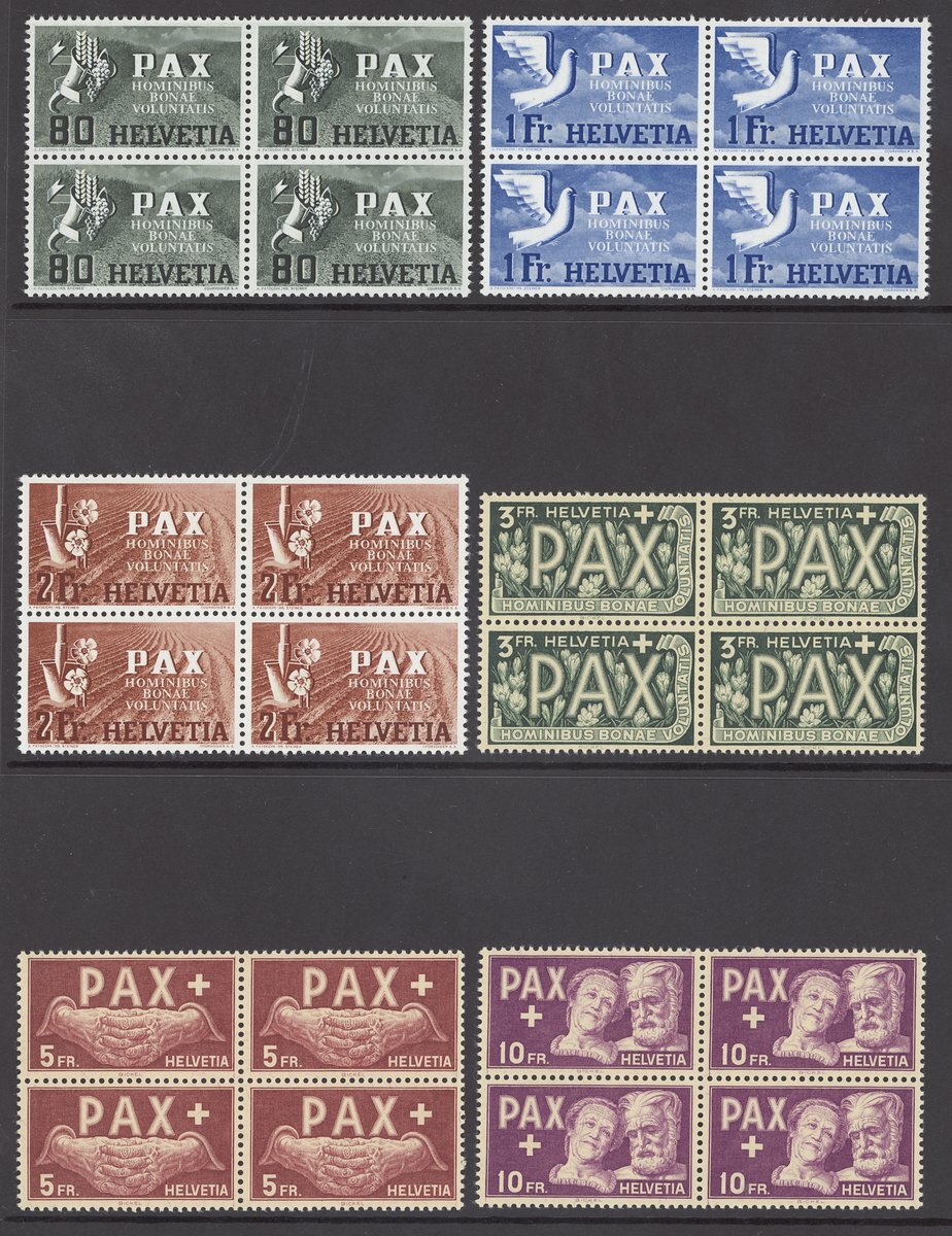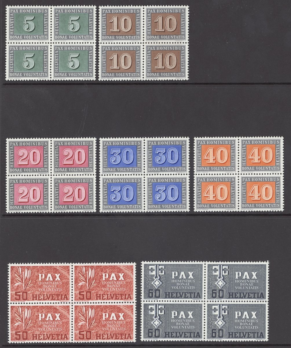 Set in blocks of four, two 50c. mounted and one 1f. with a few short perfs., otherwise fine unmounted mint and rare. S.G. 447-459, £1,100+