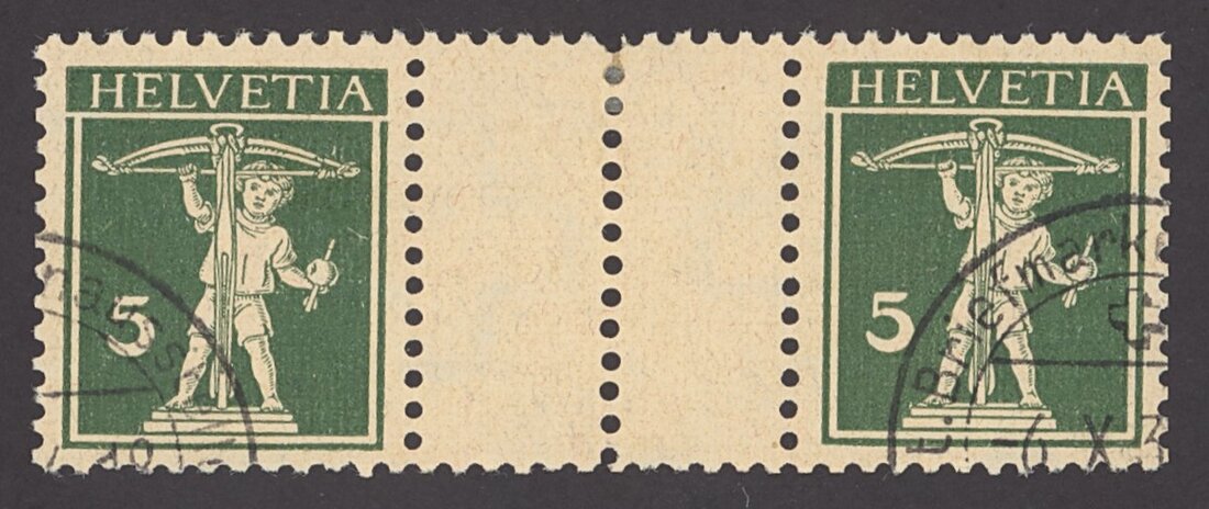 1908-33 Tell's son grilled gum 5c. deep green on buff, fine used; rare. Renggli Certificate (1990). Zumstein S40z, 1,500 Sw. Frs.