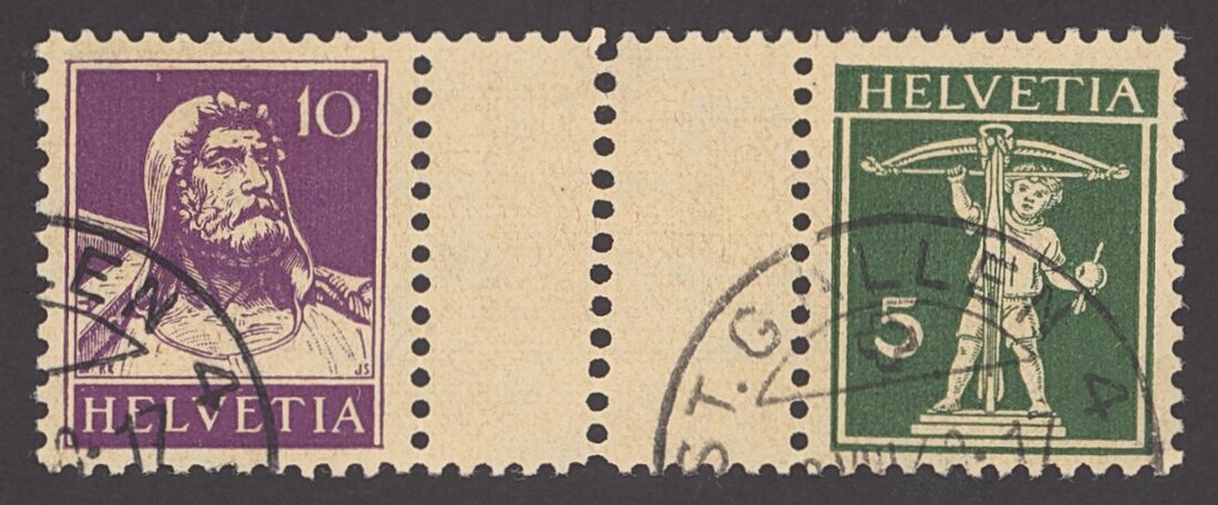 1914-33 Tell grilled gum 10c. reddish violet on buff with Tell's son 5c. deep green on buff, fine used; rare. Marchand Certificate (1995). Zumstein S42z, 1,500Sw. Frs.