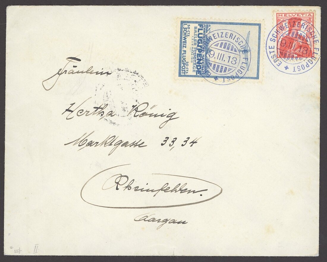 Basel 50c. blue, unusually tied to envelope additionally franked Helvetia 10c., violet Erste Schweizerische Flugpost cancellations, Rheinfelden arrival on reverse; fine. Zumstein II.