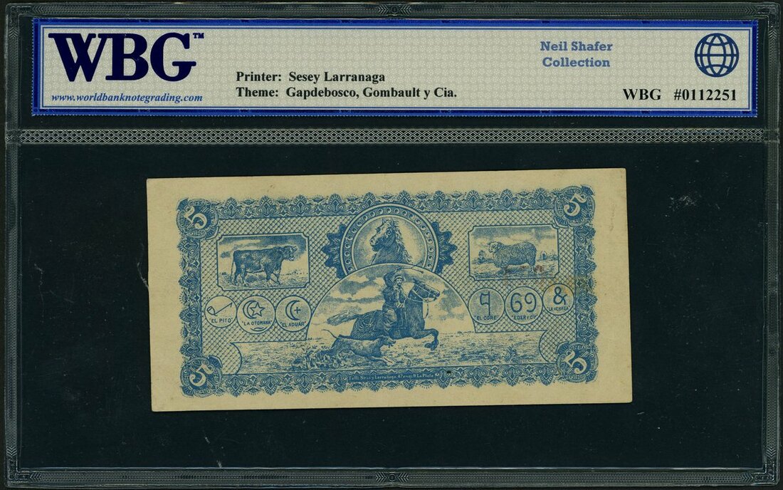 (x) Gapdebosco, Gomrault y Cia., 5 centavos, Pampa Central, 1 October 1899, red serial number 014, pale blue, man at left, Mercury top right, building top left, reverse blue, horse, bulls and gaucho