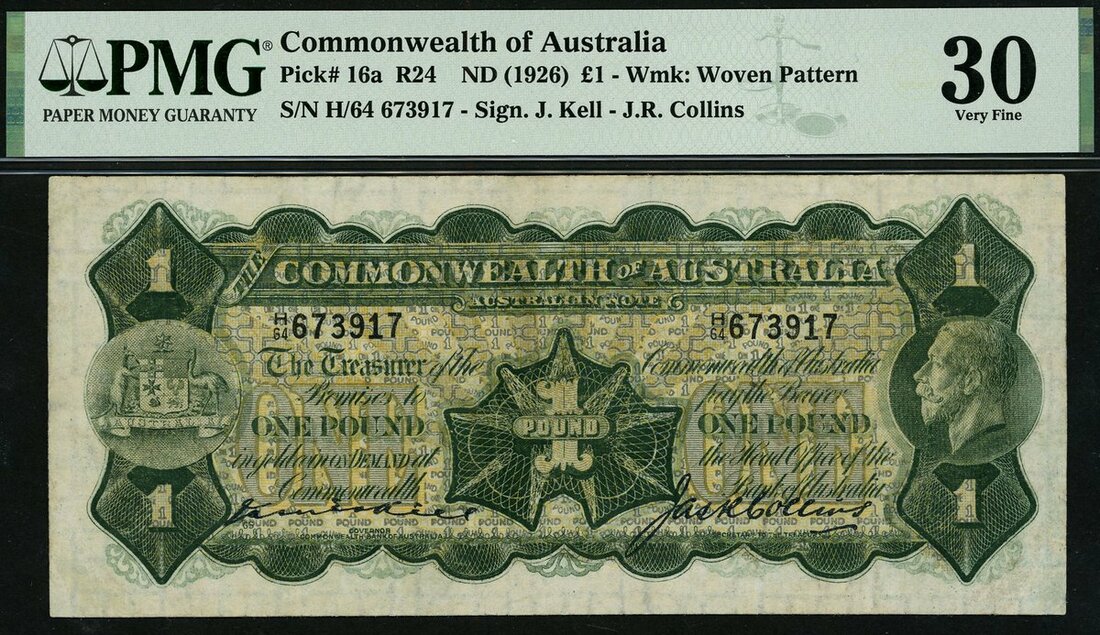 (x) Commonwealth of Australia, £1, ND (1926), serial number H/64 673917, (Pick 16a, Renniks R24), first signature type, in PMG holder, restoration, 30 Very Fine. Only 4 in higher grade on PMG Census. Scarce