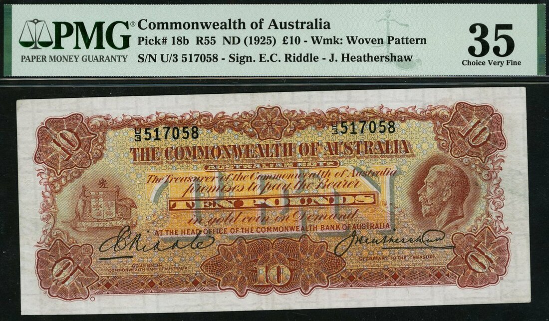 Commonwealth of Australia, £10, ND (1925), serial number U/3 517058, maroon, George V at right, arms at left, signatures Riddle and Heathershaw