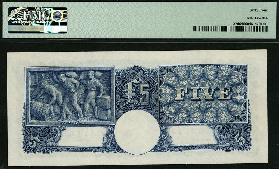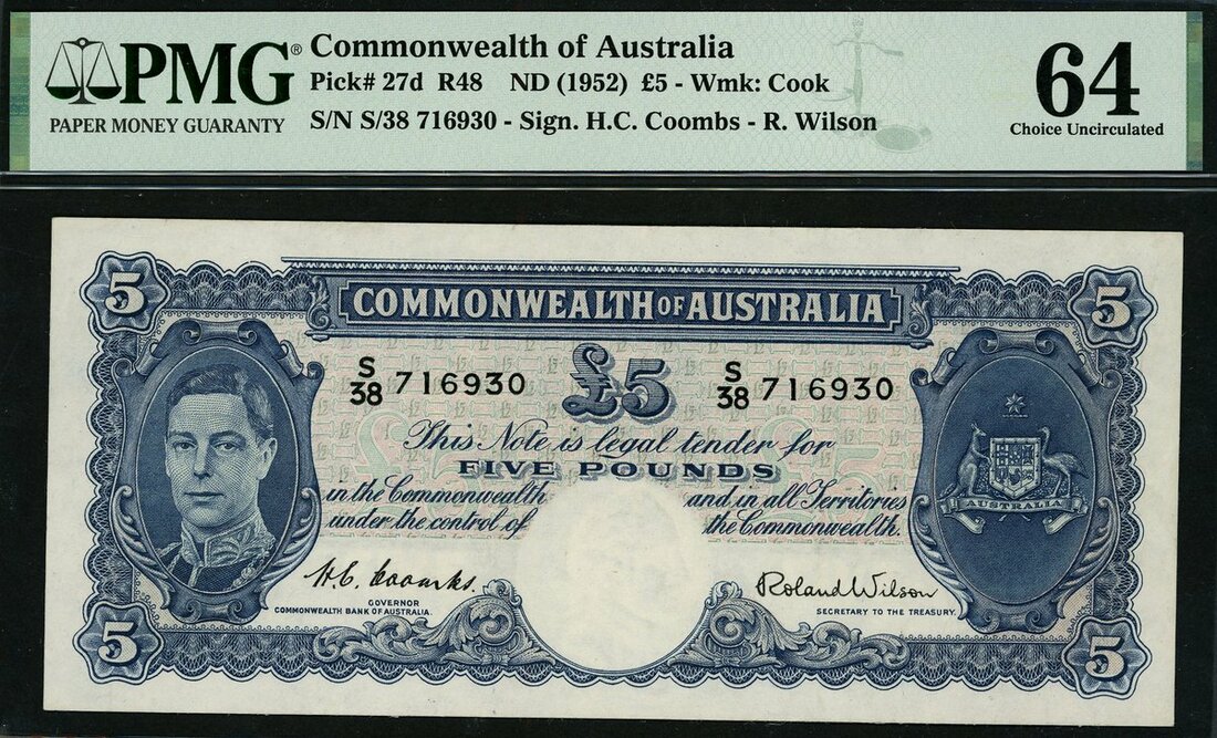 (x) Commonwealth of Australia, £5, ND (1952), serial number S/38 716930, (Pick 27d, TBB B133d, Renniks R48), last signature type, brief issue, in PMG holder 64 Choice Uncirculated. Rare in high grade