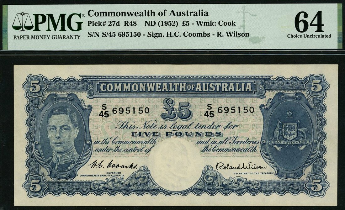 (x) Commonwealth of Australia, £5, ND (1952), serial number S/45 695150, (Pick 27d, TBB B133d, Renniks R48), last signature type, brief issue, in PMG holder 64 Choice Uncirculated. Rare in high grade