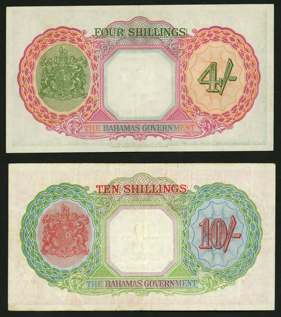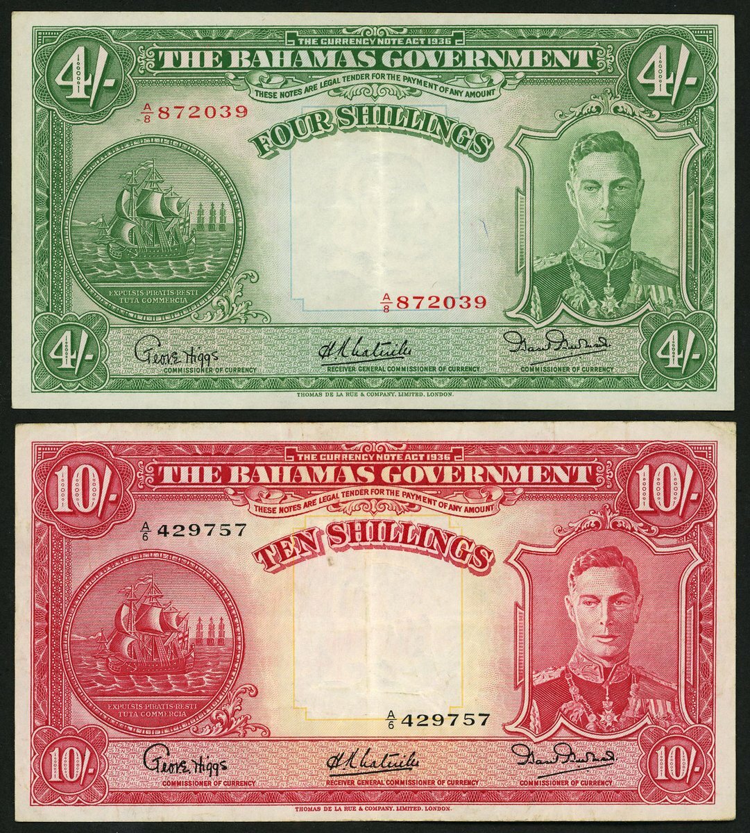 Bahamas Government, 10 shillings, ND (1947), serial number A/6 429757, also a 4 shillings, ND (1947), prefix A/8,