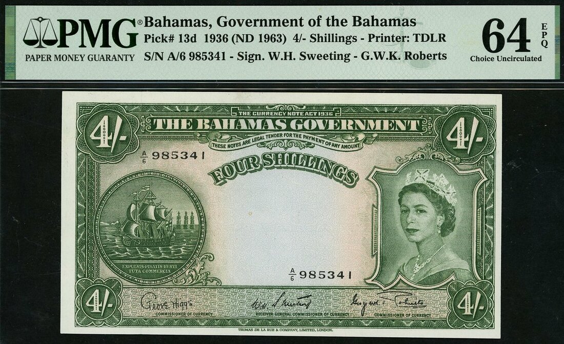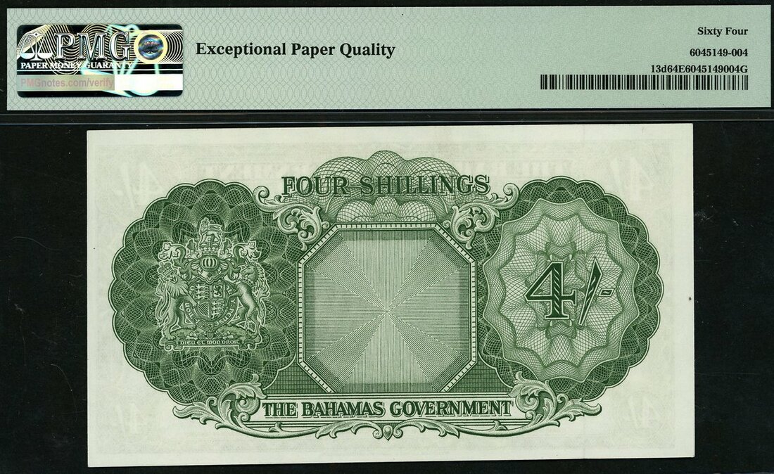 (x) Bahamas Government, 4 shillings, ND (1963), serial number A/6 985341, (Pick 13d, TBB B112d), last date and prefix, in PMG holder 64 EPQ Choice Uncirculated