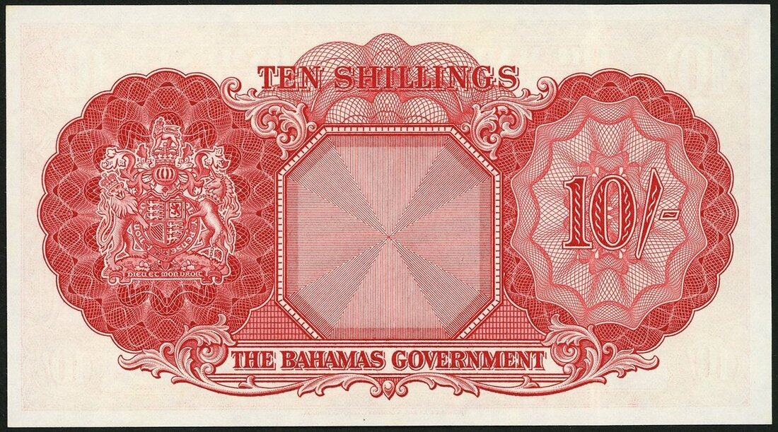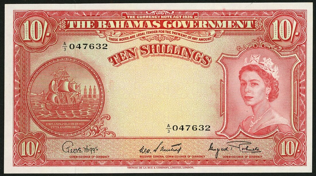 Bahamas Government, 10 shillings, ND (ND 1963), serial number A/3 047632, red and pale orange, Elizabeth II at right, sailing ship seal at left, value at corners, signatures of Higgs, Sweeting and Roberts, reverse red and white, arms at left, value at right