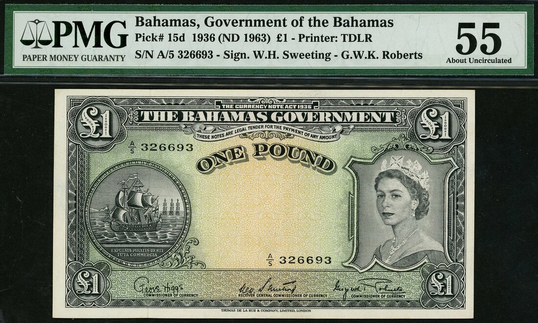 (x) The Bahamas Government, £1, 1936 (1953), serial number A/5 326693, black, green, yellow and orange, Queen Elizabeth II at right, signature of George Vincent Emile Higgs, William Hart Sweeting, George W. K. Roberts, reverse, Coat of Arms at left, denomination at right