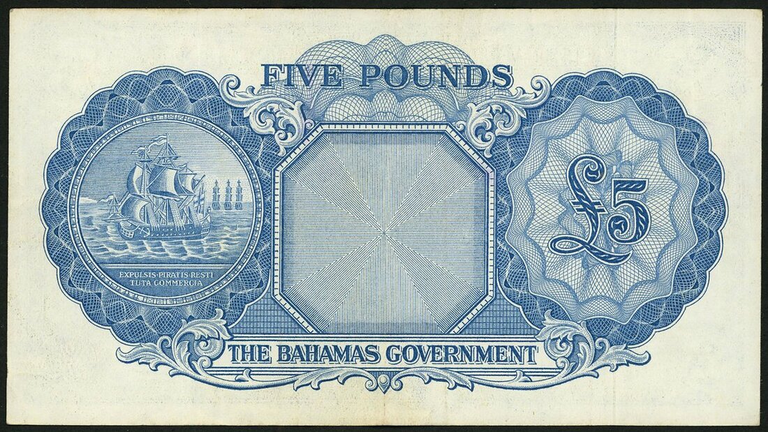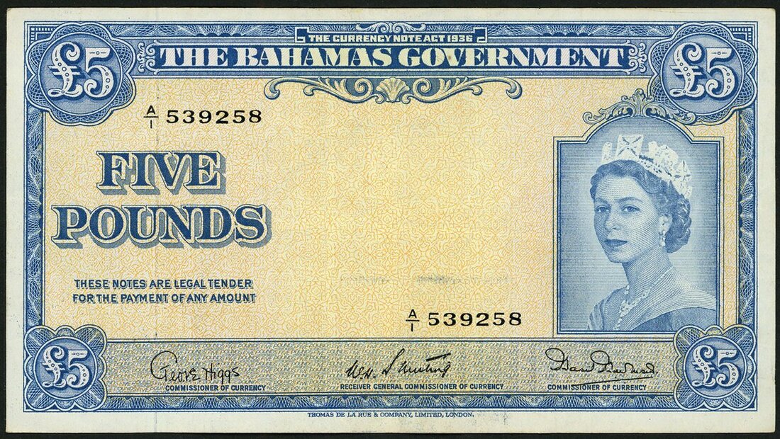 Bahamas Government, £5, ND (1963), serial number A/1 539258, blue on tan and yellow underprint, Elizabeth II at right, value at left and at corners, reverse blue, sailing ship seal at left, value at right, Higgs, Sweeting and Burnside signatures