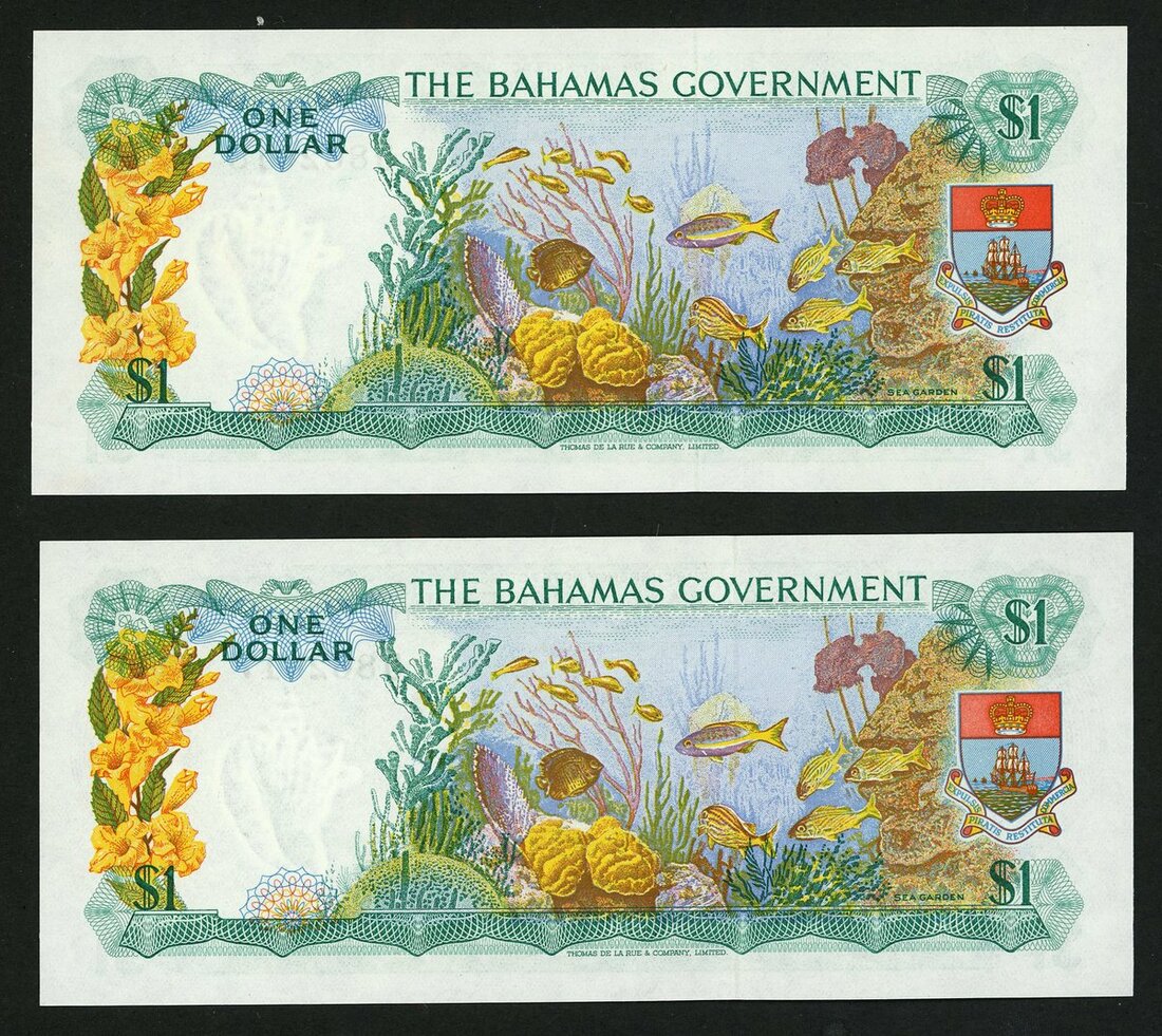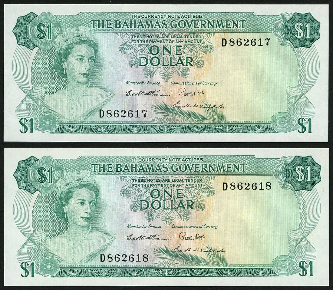 (x) Bahamas Government, consecutive 1 dollar, 1965, serial number D 862617-18, (Pick 18b), About Uncirculated (2 notes)