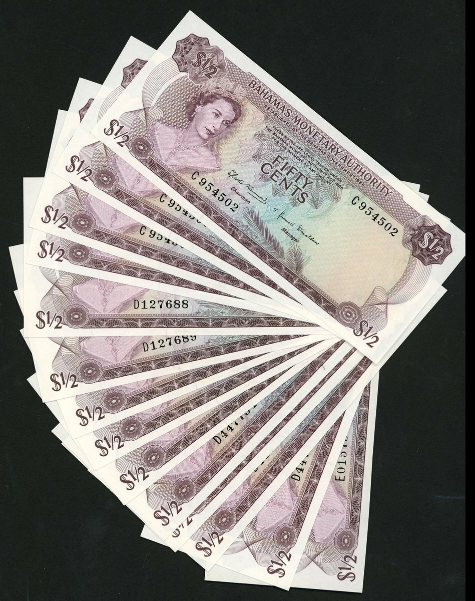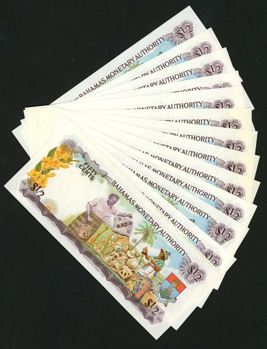 Bahamas Monetary Authority, 1/2 dollar (14), 1968, (Pick 26, TBB B201), uncirculated, one example with glue at reverse top margin. Includes some consecutive runs (14 notes)