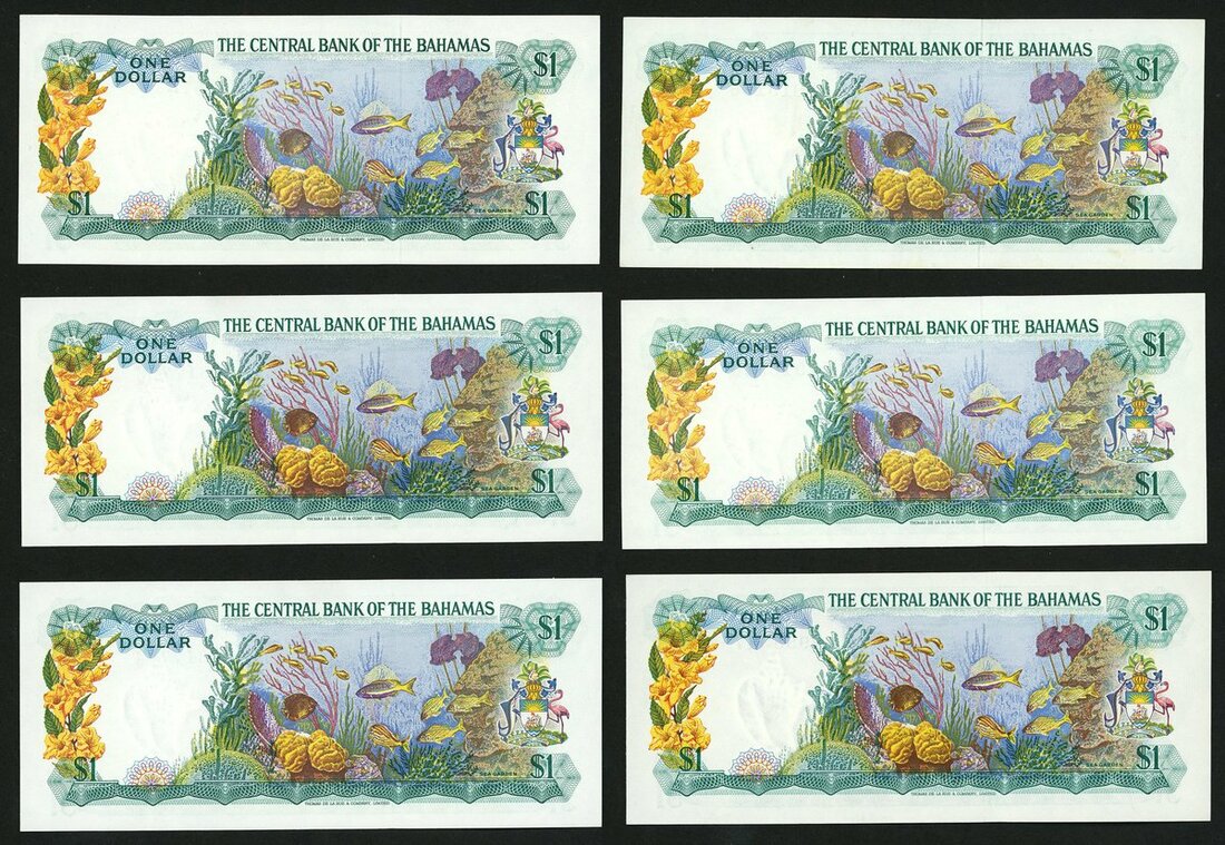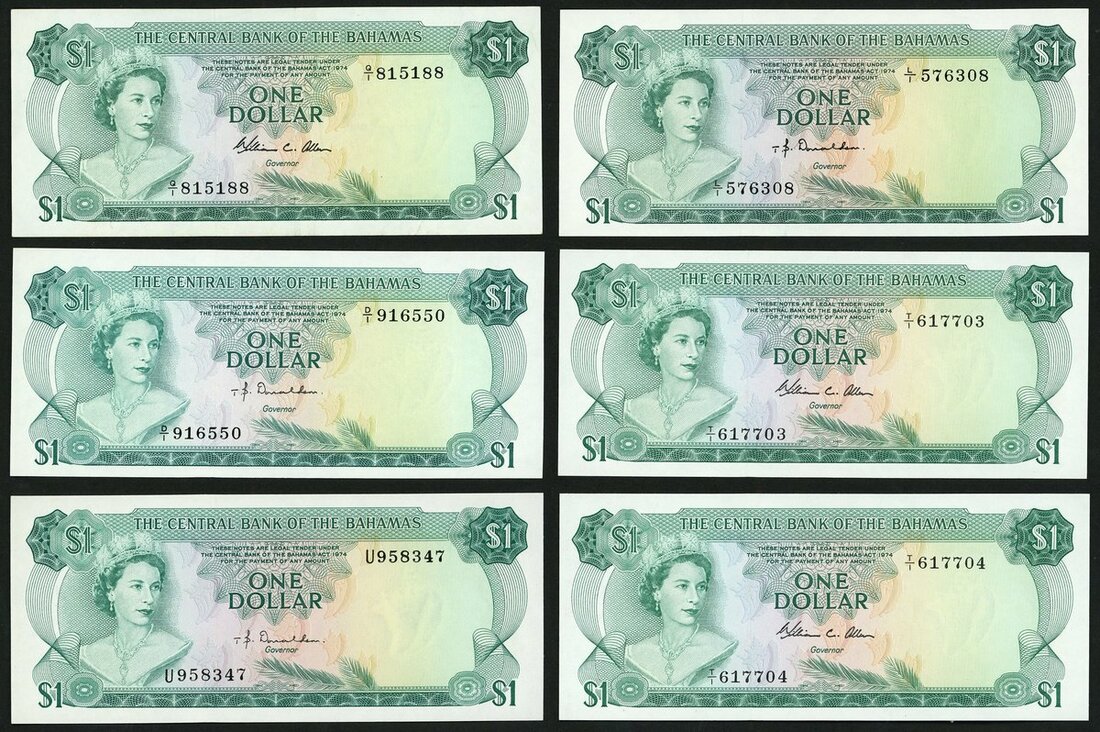 Central Bank of The Bahamas, 1 dollar (6), 1974, (Pick 35a, 35b), mostly uncirculated with one extremely fine example (6 notes)