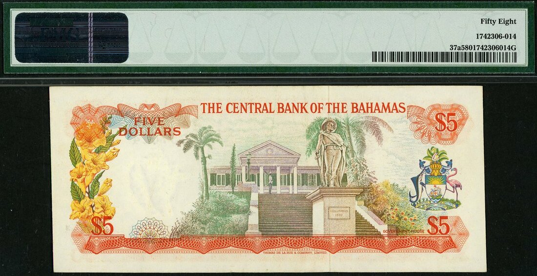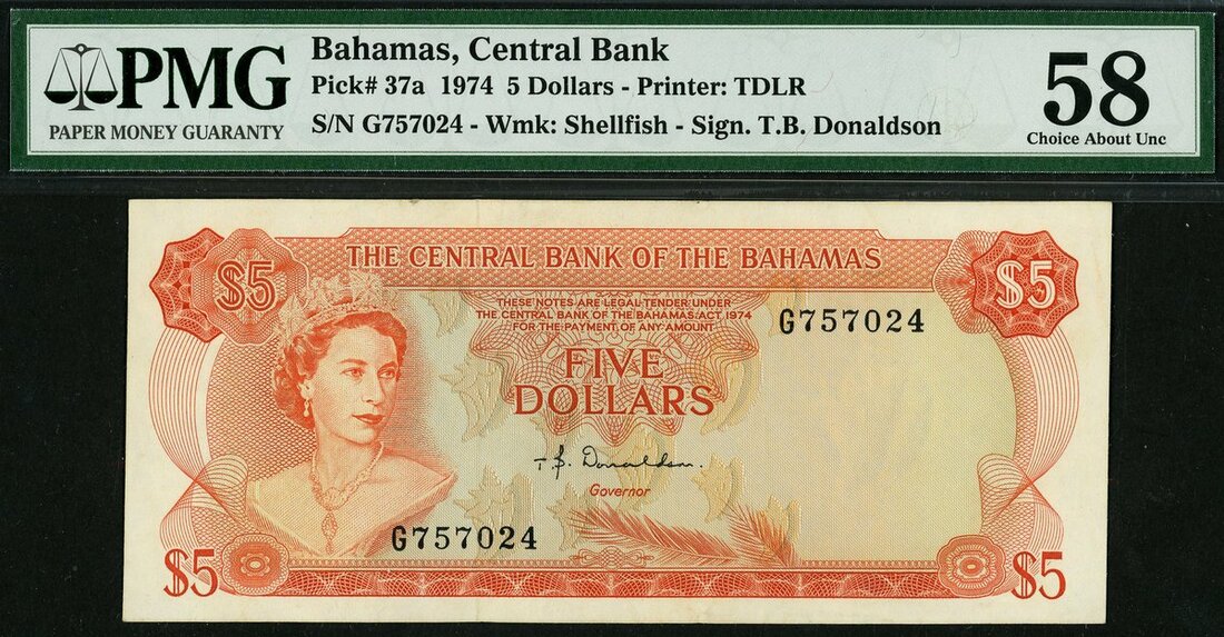 (x) Central Bank of The Bahamas, $5, 1974, serial number K424070, (Pick 37a, TBB B302a), in PMG holder 58 Choice About Uncirculated