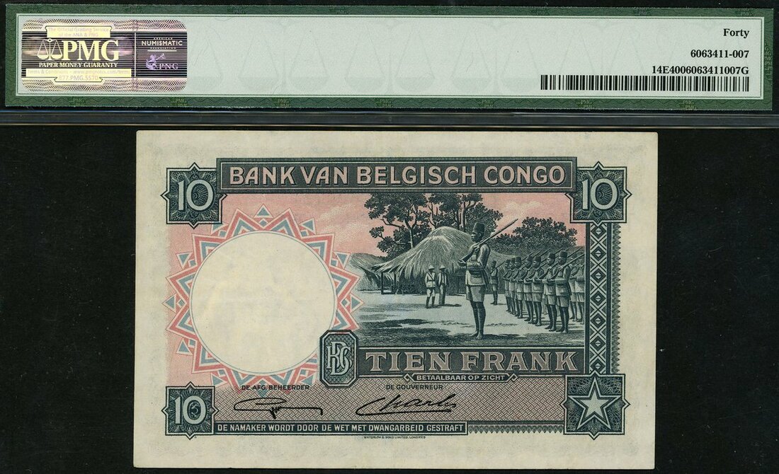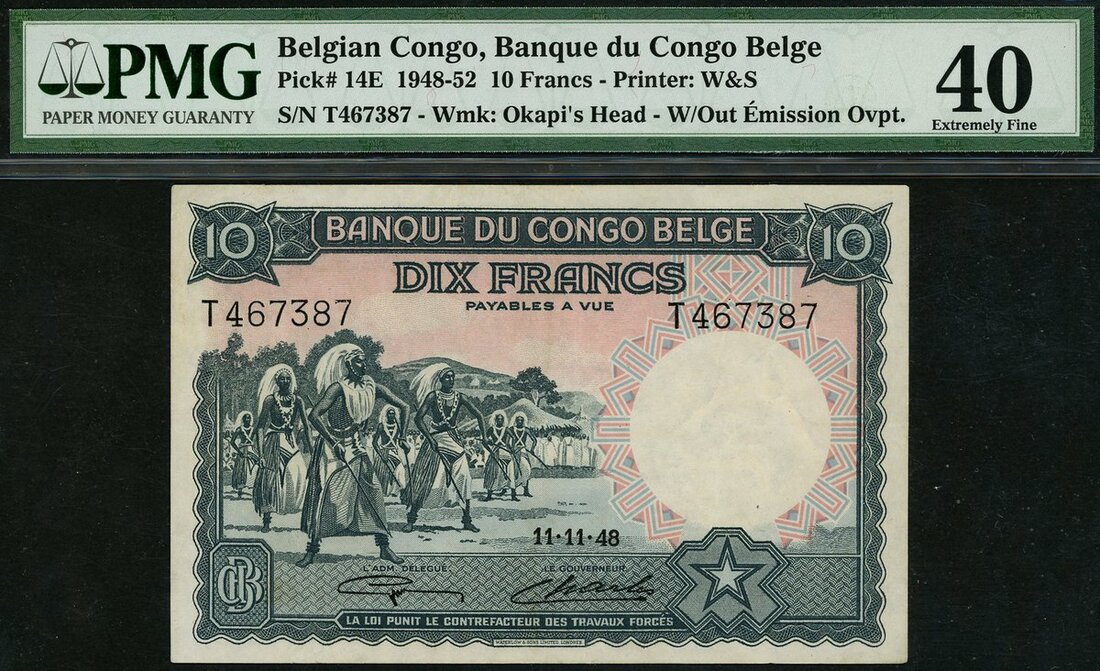 (x) Belgian Congo, 10 francs, 1948, serial number T467387, dark green on multicolour underprint,