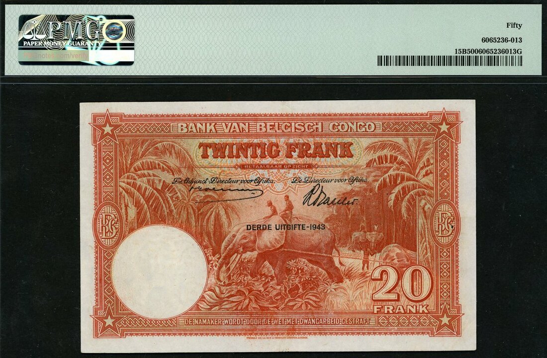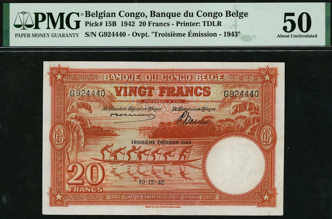 (x) Belgian Congo, 20 francs, 10th December 1942, serial number G924440, overprinted 'Troisieme Emission-1943' on reverse