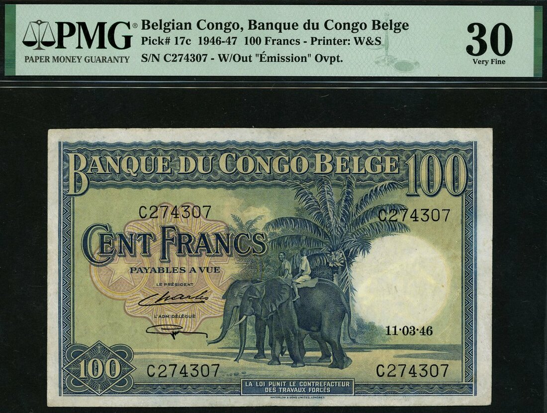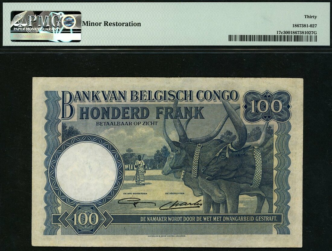 (x) Belgian Congo, 100 Francs, 11.3.1946, serial number C274307, (Pick 17c), in PMG holder 30 Very Fine, Minor Restoration, nonetheless scarce, beautiful design