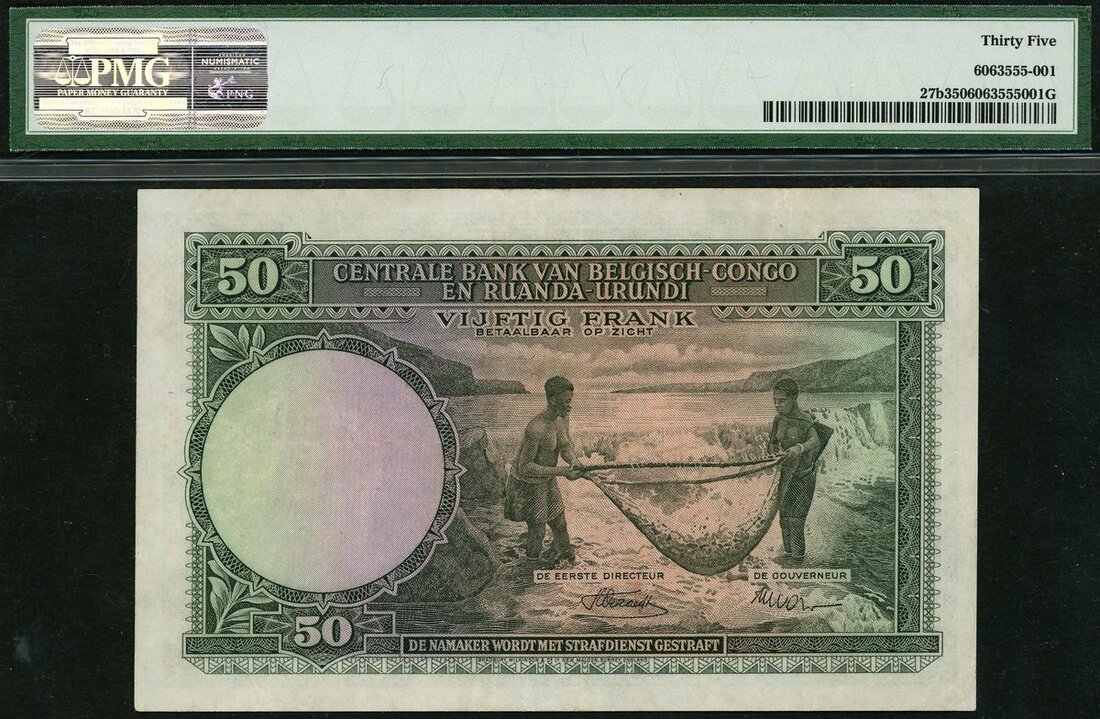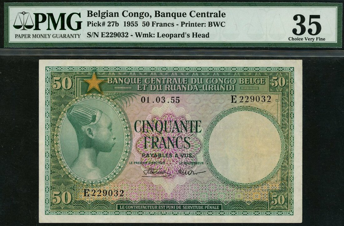 (x) Belgian Congo, 50 francs, 1955, serial number E229032, green on multicolour underprint, watermark of leopard at right, native portrait at left,
