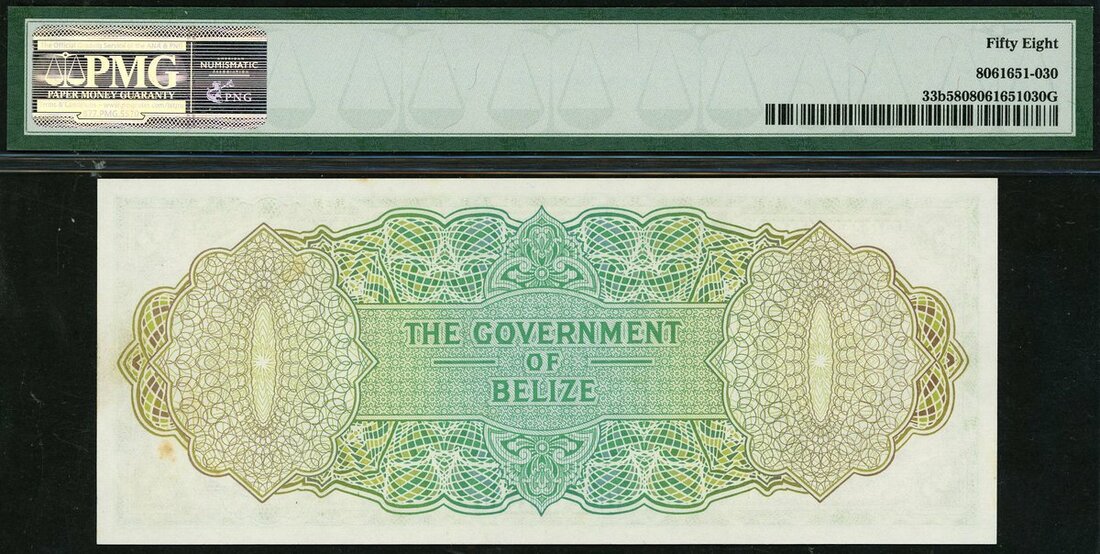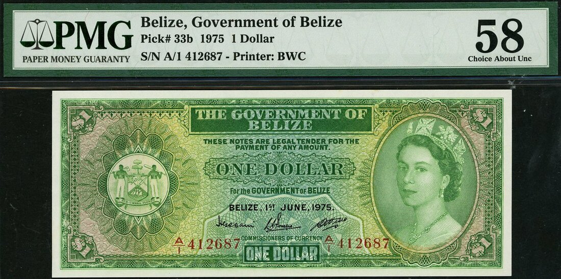 (x) Government of Belize, $1, 1 June 1975, red serial number A/1 412687, green on multicolour, arms at left, Elizabeth II at right, reverse green, guilloche pattern