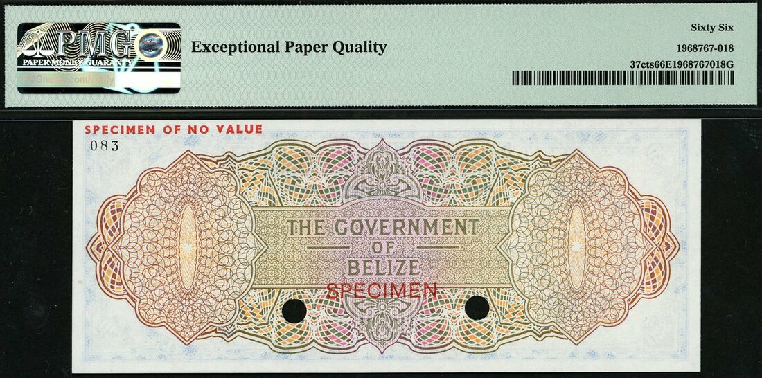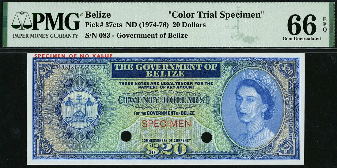 The Government of Belize, colour trial specimen $20, ND (1974-76), (Pick 37cts, TBB B105t), in PMG holder 66 EPQ Gem Uncirculated, scarce
