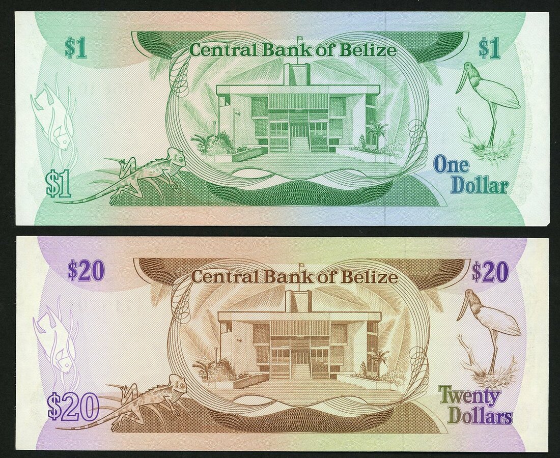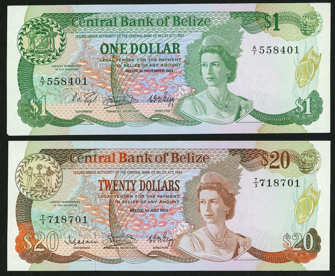 Central Bank of Belize, $20, 1 July 1983, serial number T/3 718701, also $1, 1983,